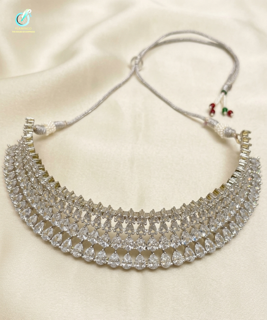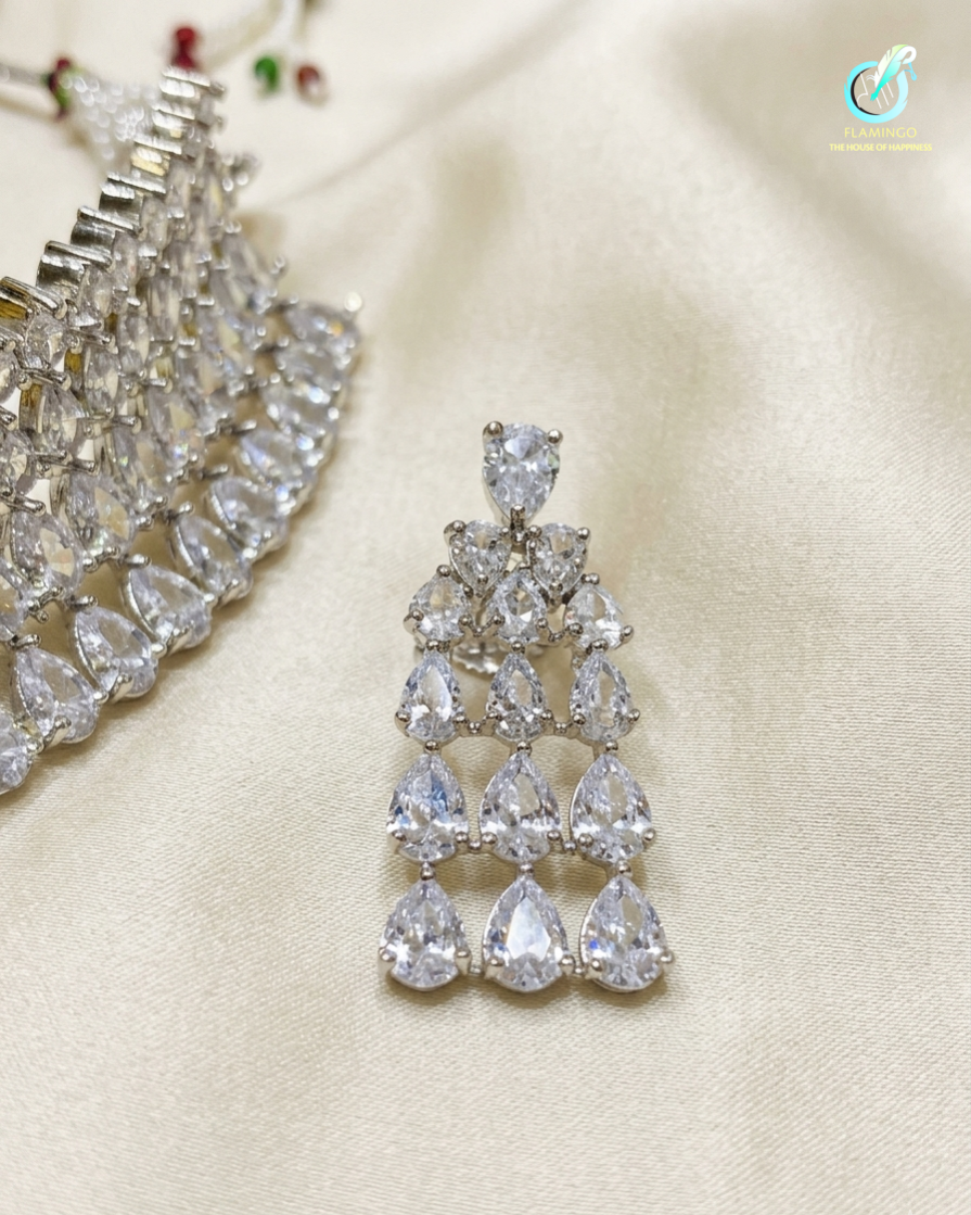 The Aavya Cascade is a masterpiece of light and luxury, inspired by the ethereal beauty of the first morning sun. This regal jewelry set features a multi-layered diamond-choker and matching chandelier earrings, meticulously crafted to drape with the fluidity of a shimmering waterfall. A stunning four‑layer, delicate graduated‑tire choker crafted from high‑quality, skin‑friendly material with an anti‑tarnish finish. Each layer is set with brilliant, pure‑cut teardrop stones that catch and reflect light from every angle, creating a luminous, cascading sparkle. The matching earrings feature the same elegant teardrop design heighted 6cm.