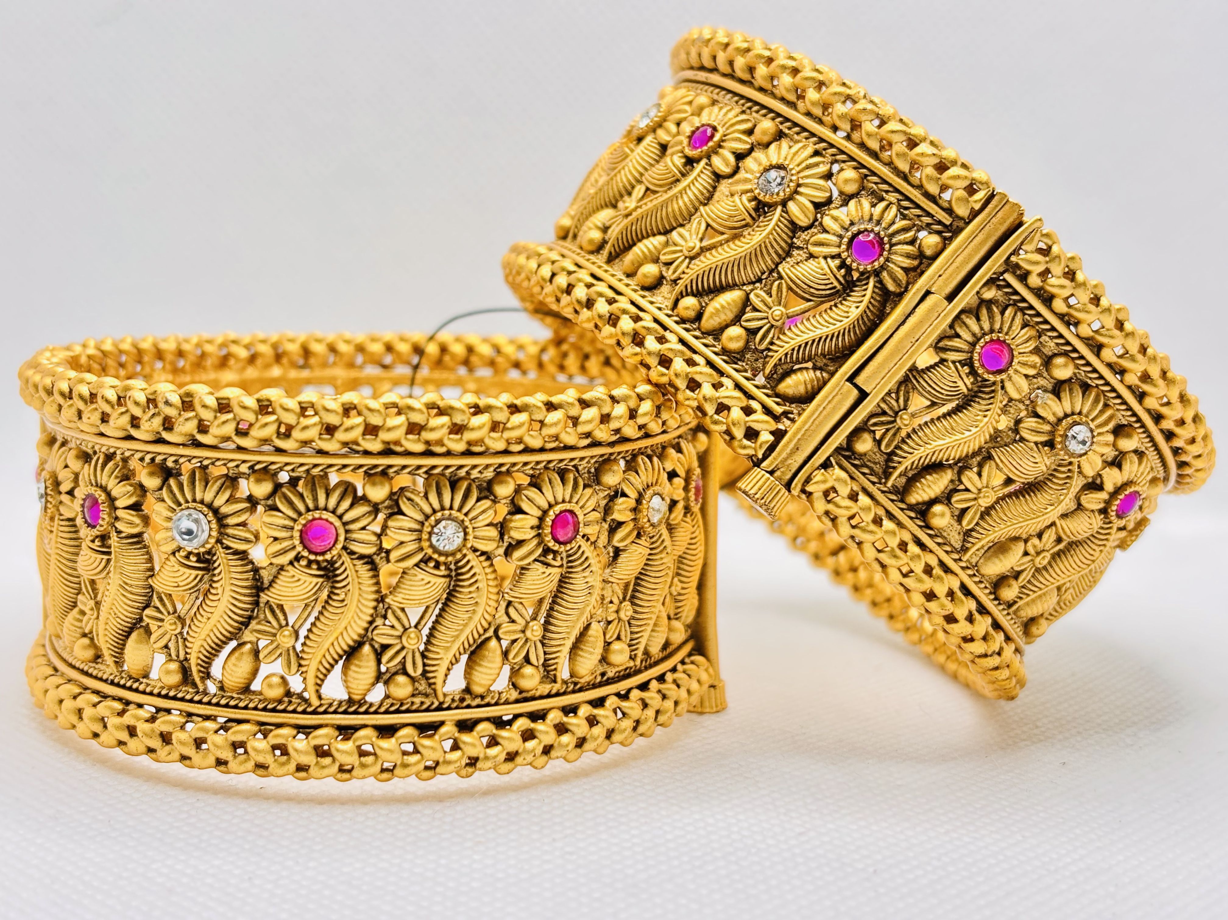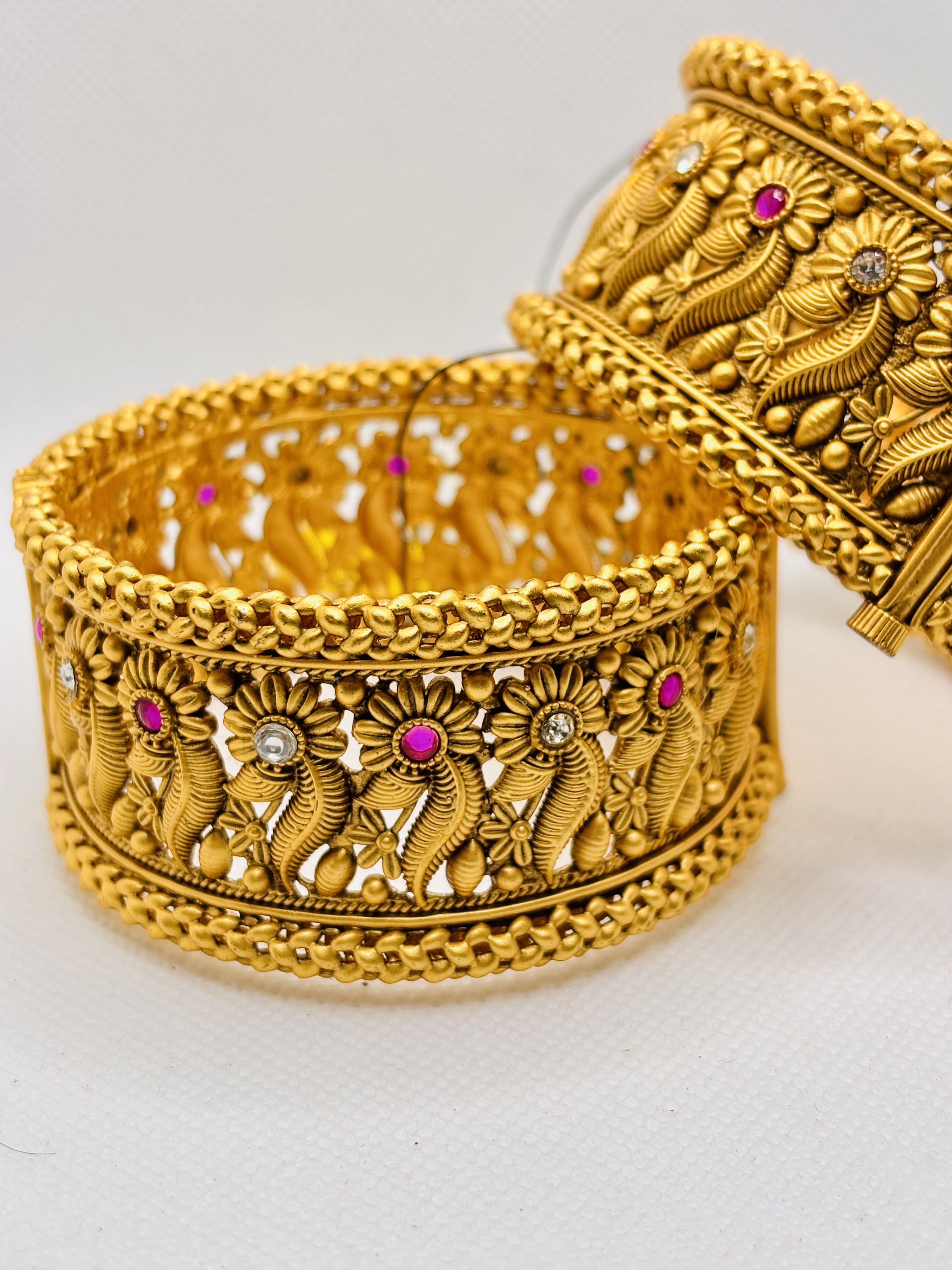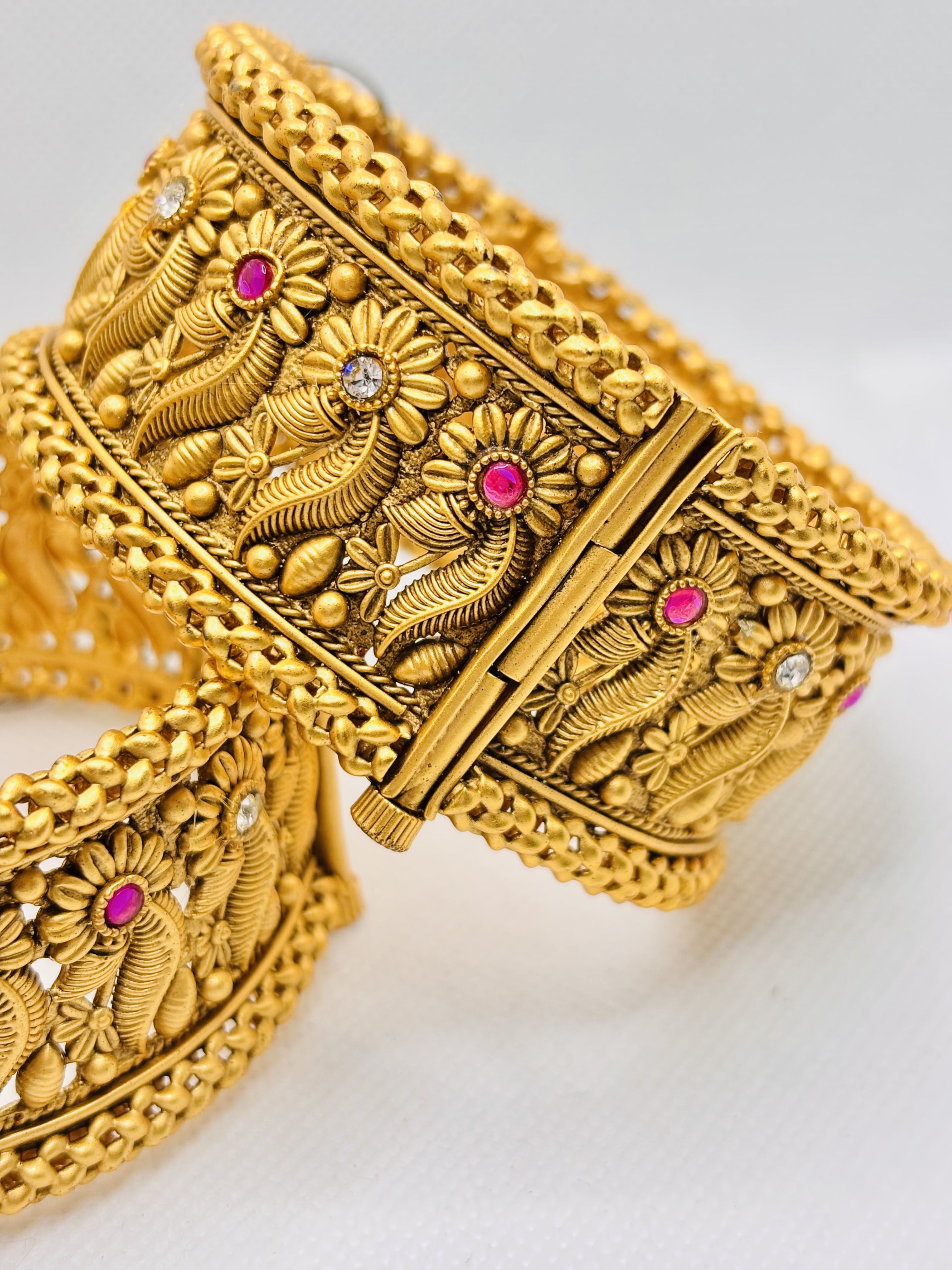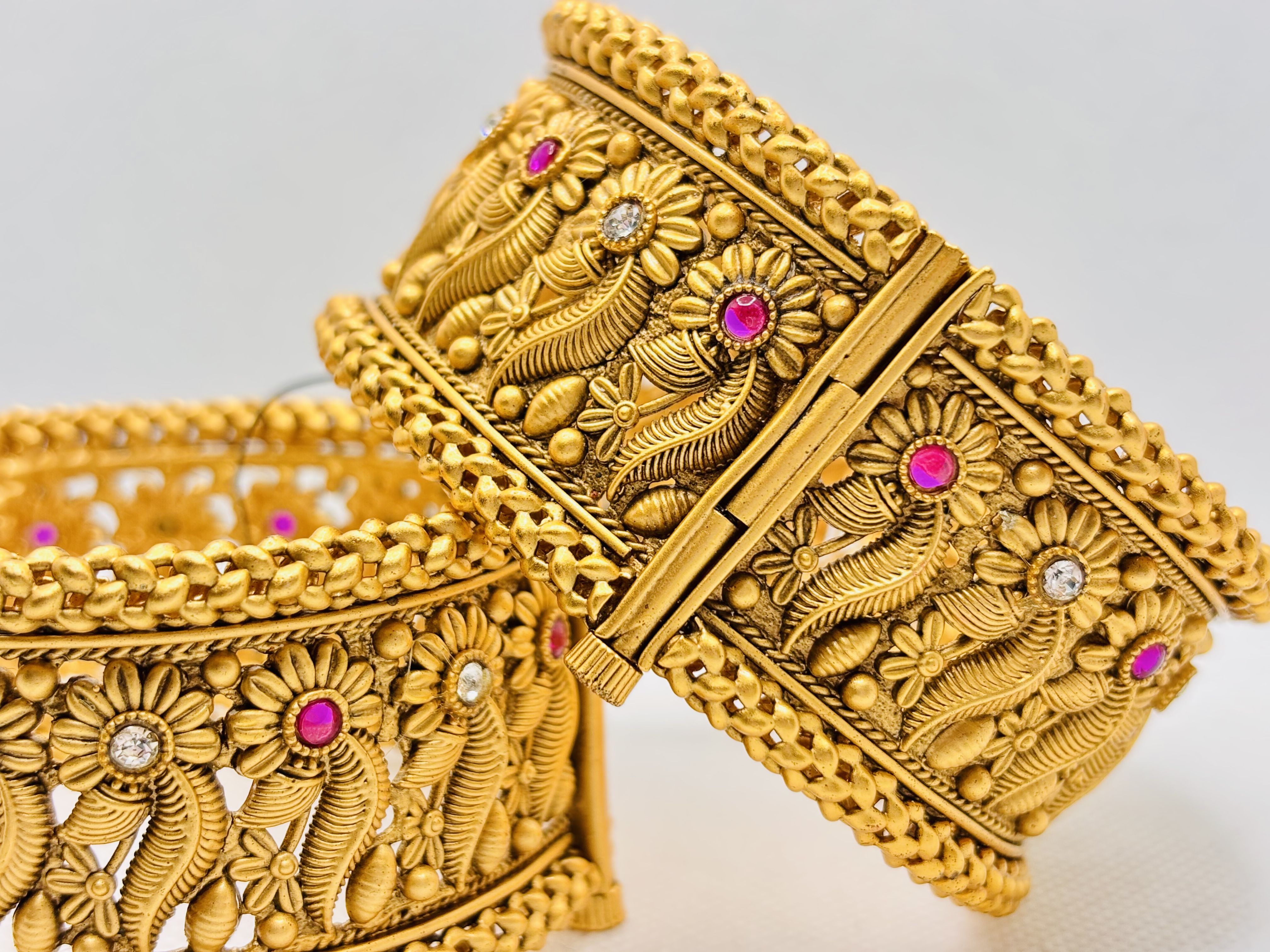 One‑of‑a‑kind antique‑style gold kada featuring hand‑etched flower and leaf patterns framed by rope‑twisted borders and luminous ruby‑pink & diamond‑white stones, perfect for adding majestic flair to any traditional ensemble.