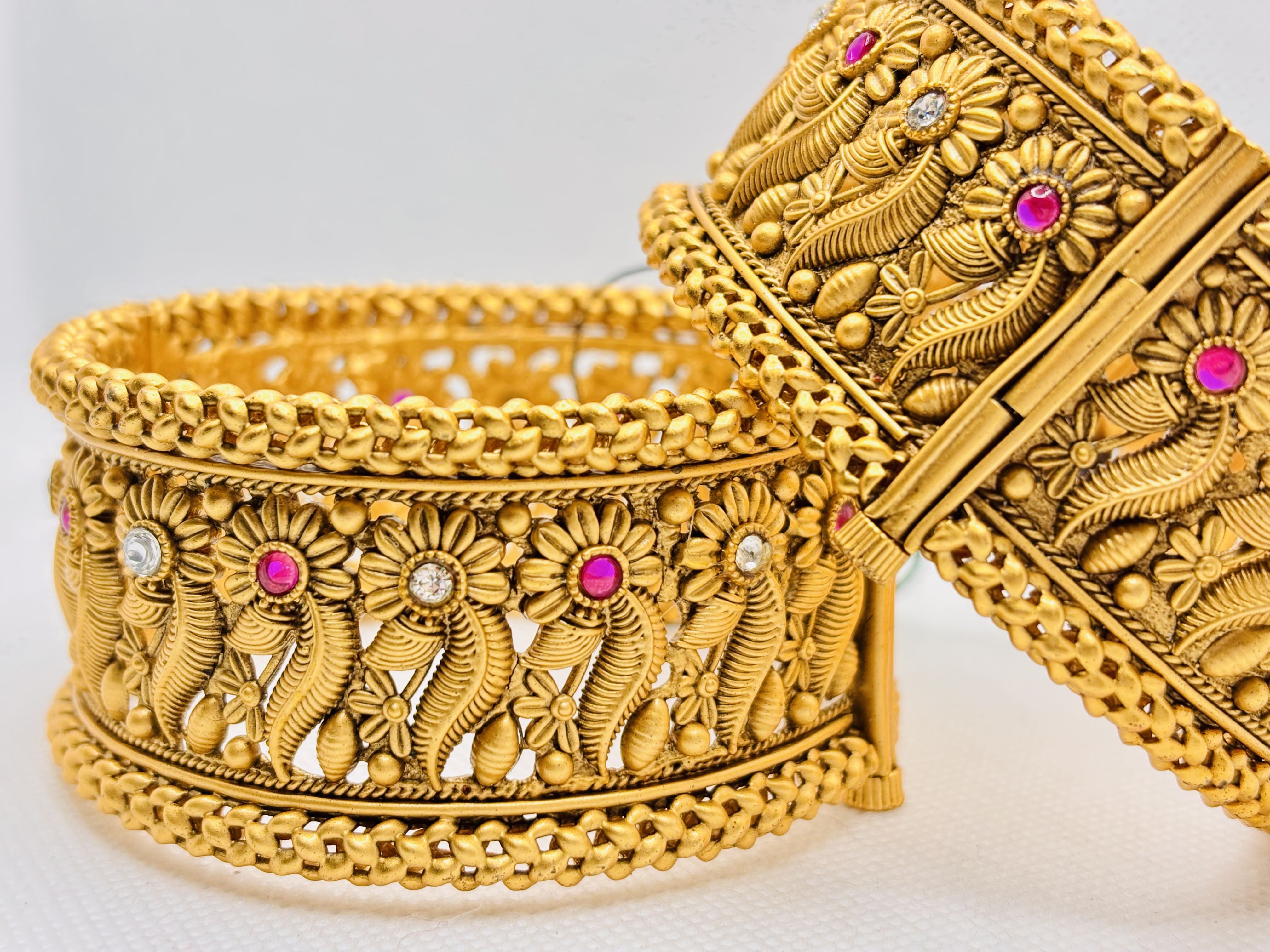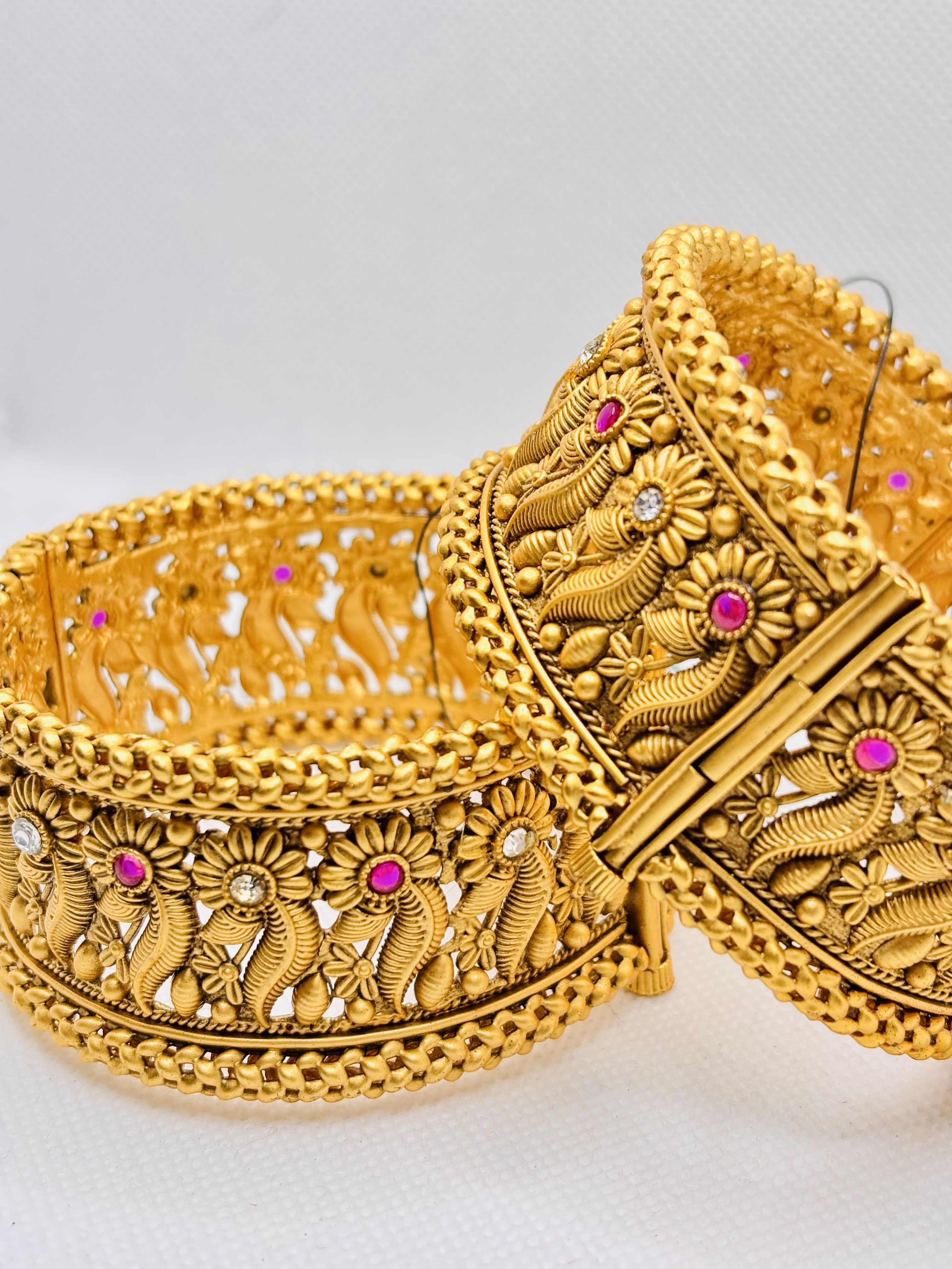 18K Gold Plated kada with intricated floral filigree with pink and crystal gem accents, has a twisting adge to open. It has been crafted with advanced plating that ensures long‑lasting beauty even after repeated use.