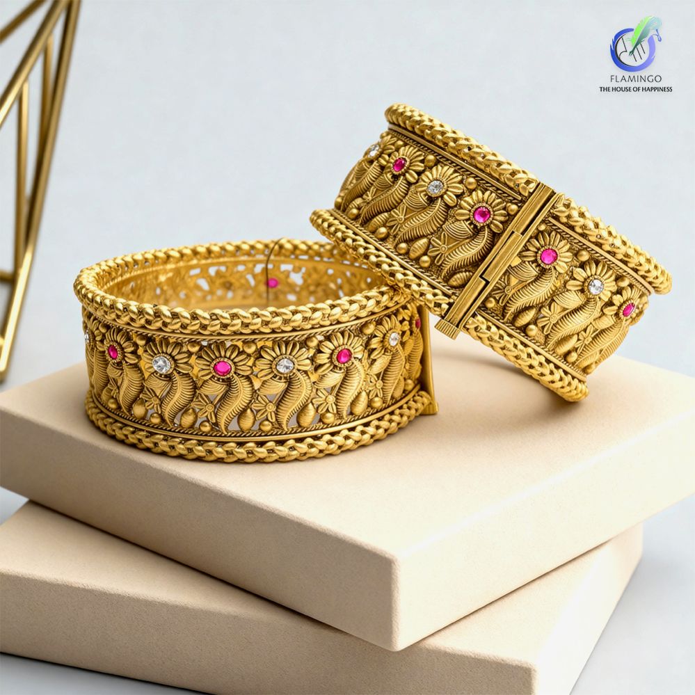 One‑of‑a‑kind antique‑style gold kada featuring hand‑etched flower and leaf patterns framed by rope‑twisted borders and luminous ruby‑pink & diamond‑white stones, perfect for adding majestic flair to any traditional ensemble.