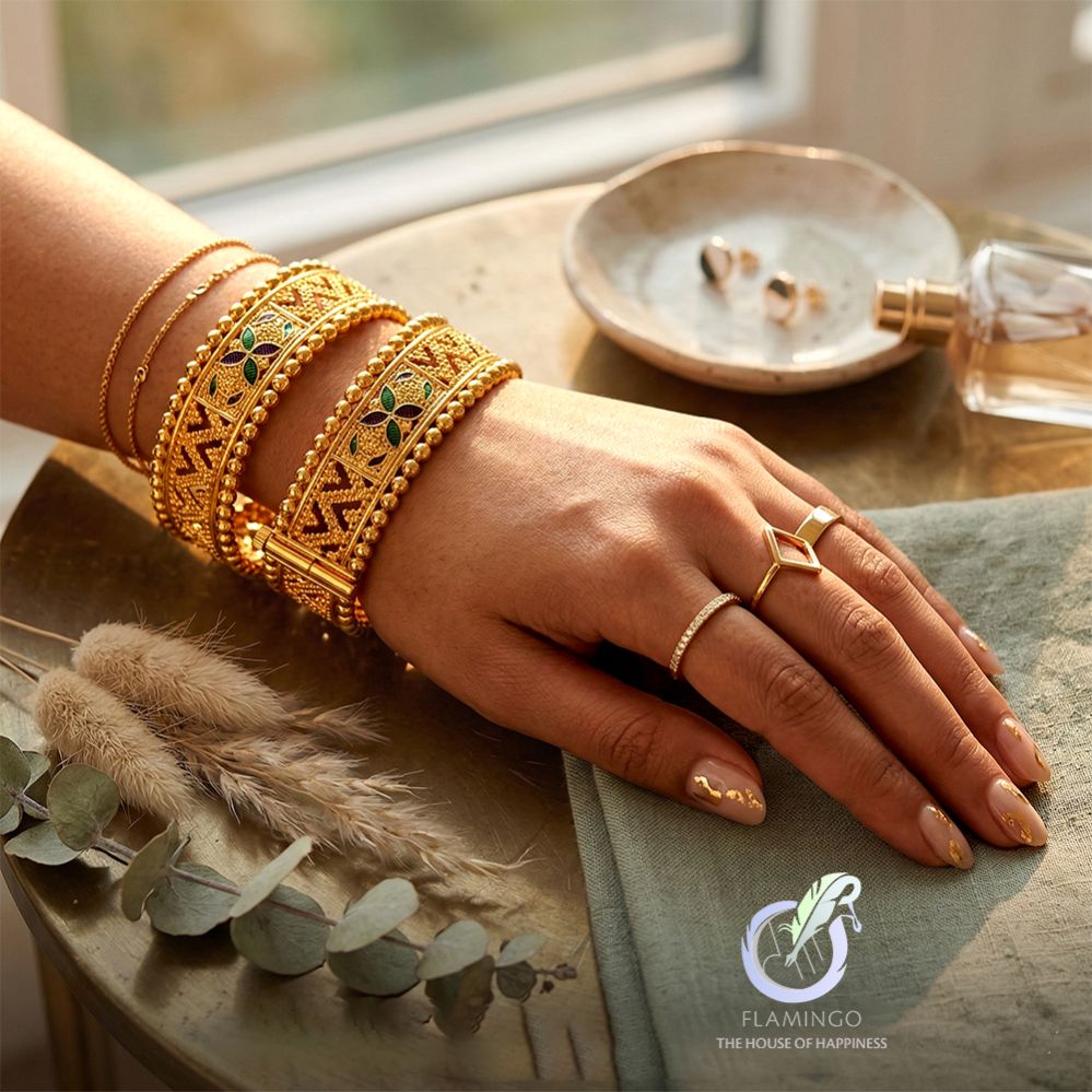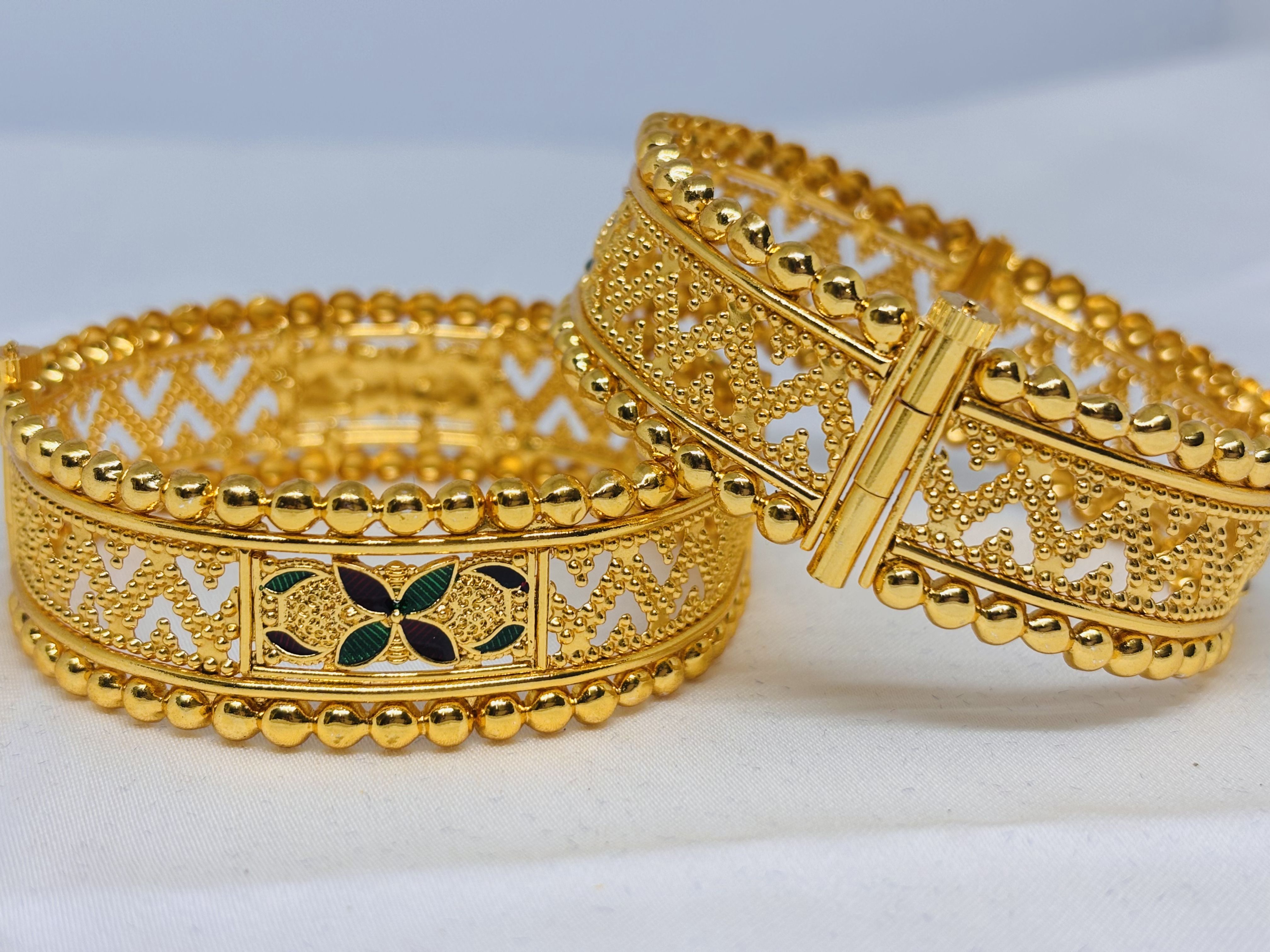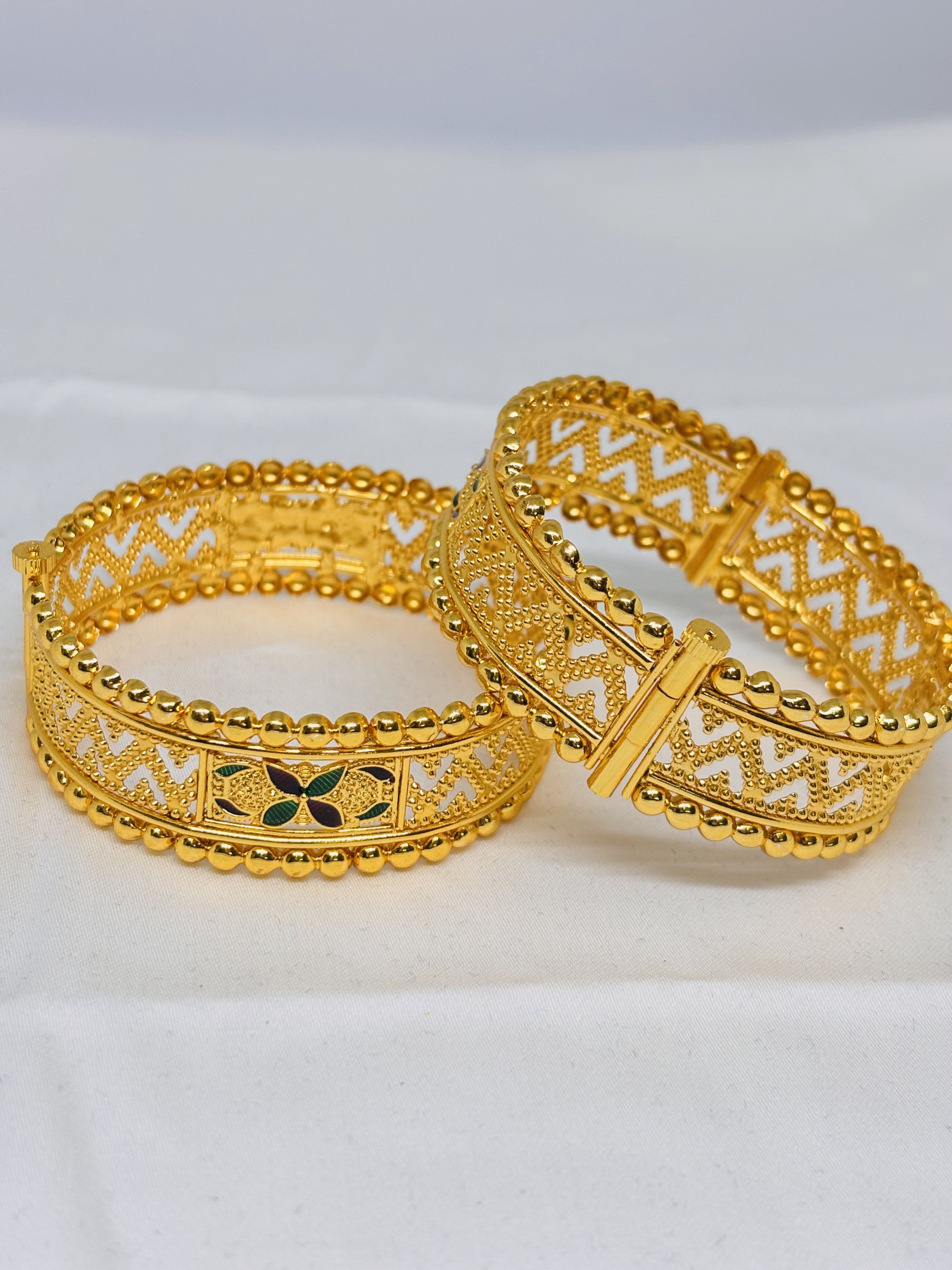 18K Gold Plated Meena work bangle with a screw fitting, It has been crafted with advanced plating that ensures long‑lasting beauty even after repeated use. The thick, sturdy design makes a statement while remaining wearable