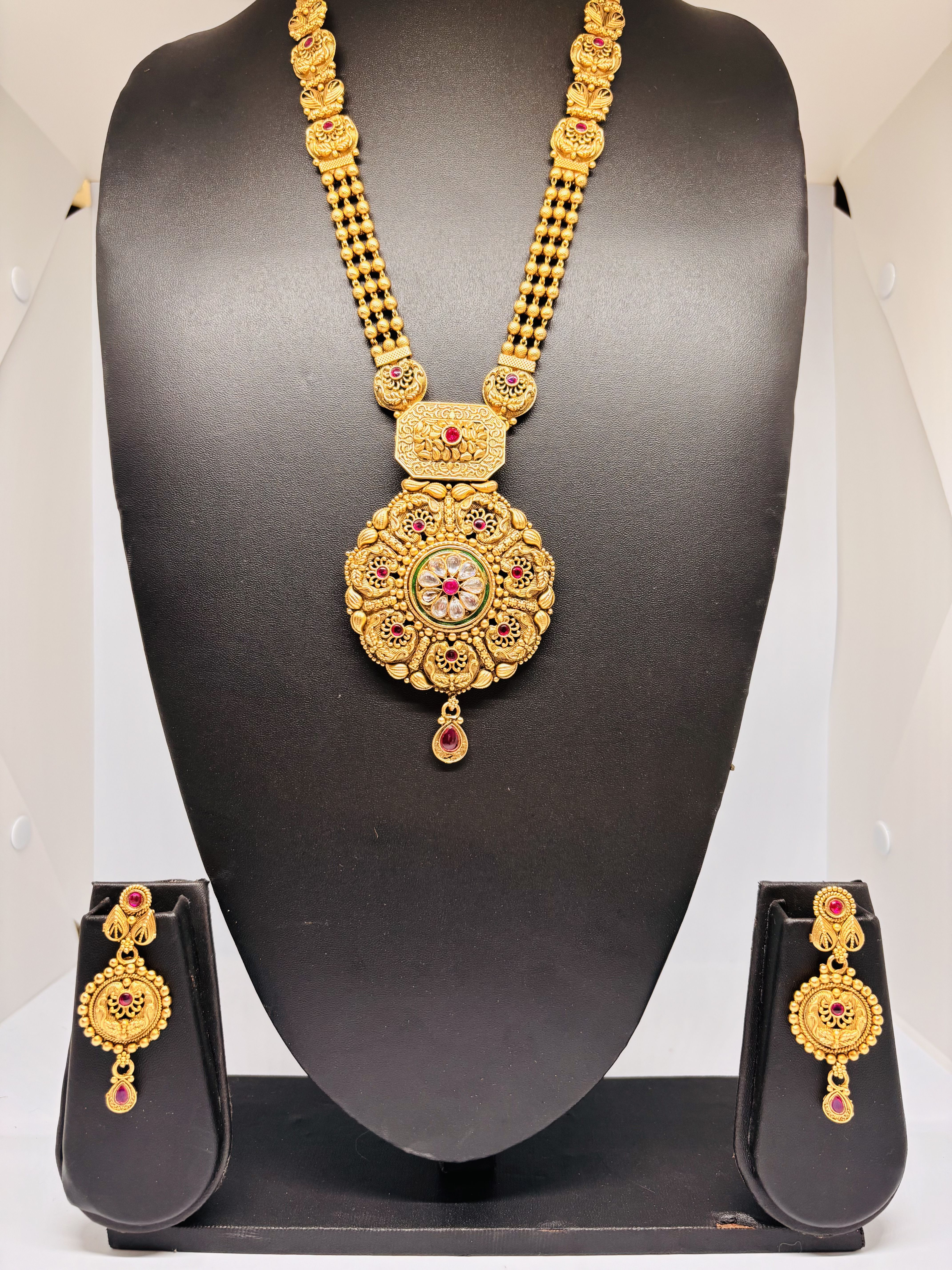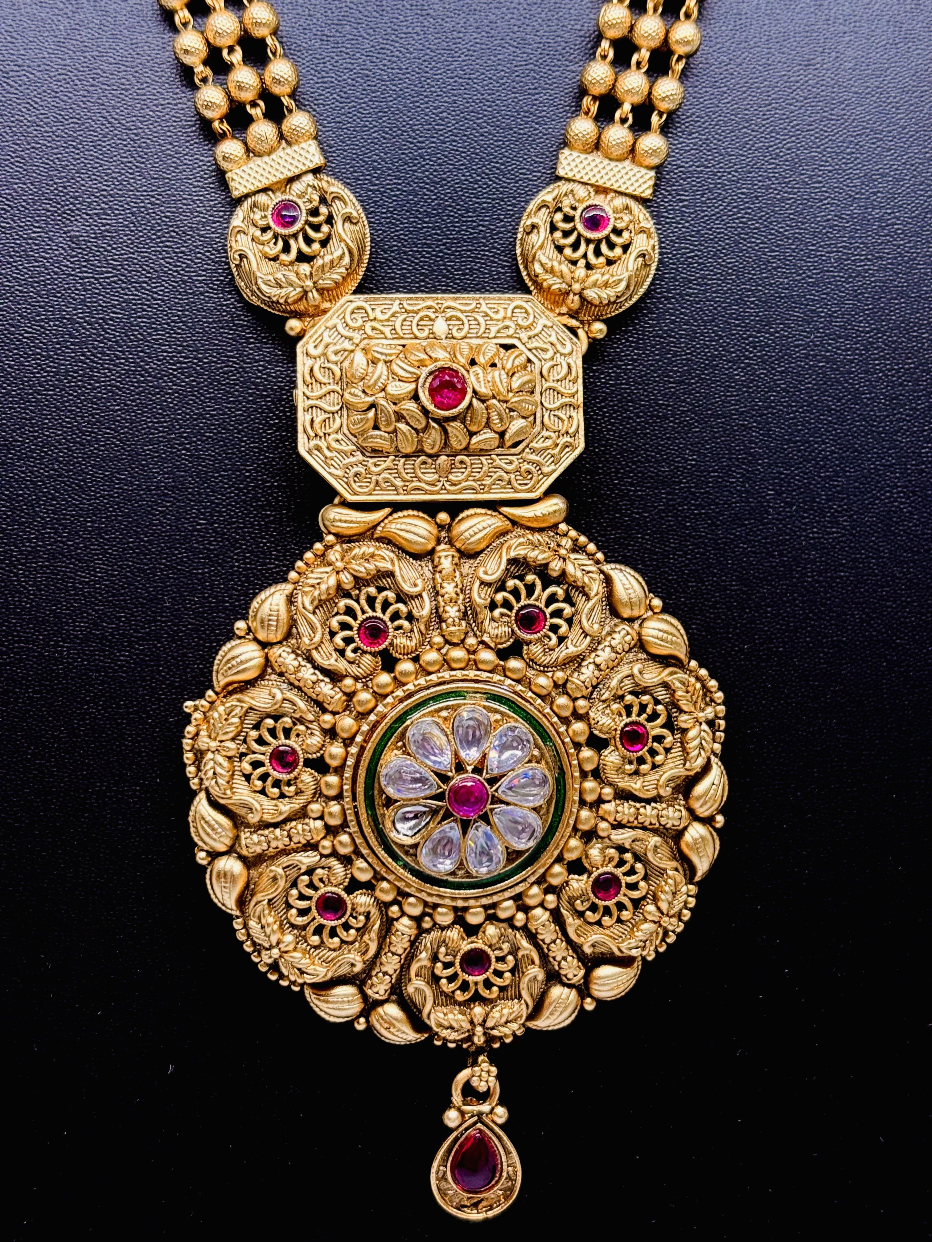 A regal temple-inspired jewellery set, finished in 18K gold plating, showcasing a grand circular pendant with a central floral arrangement of transparent stones encircled by a green enamel border and deep pink gemstones, surrounded by intricate gold detailing and peacock motifs. The necklace comes with a tassel to adjust. The matching earrings feature deep pink stones set in floral designs. these are crafted with Advanced plating ensures long-lasting beauty, even with several use. Height of the earrings- 6 cm.