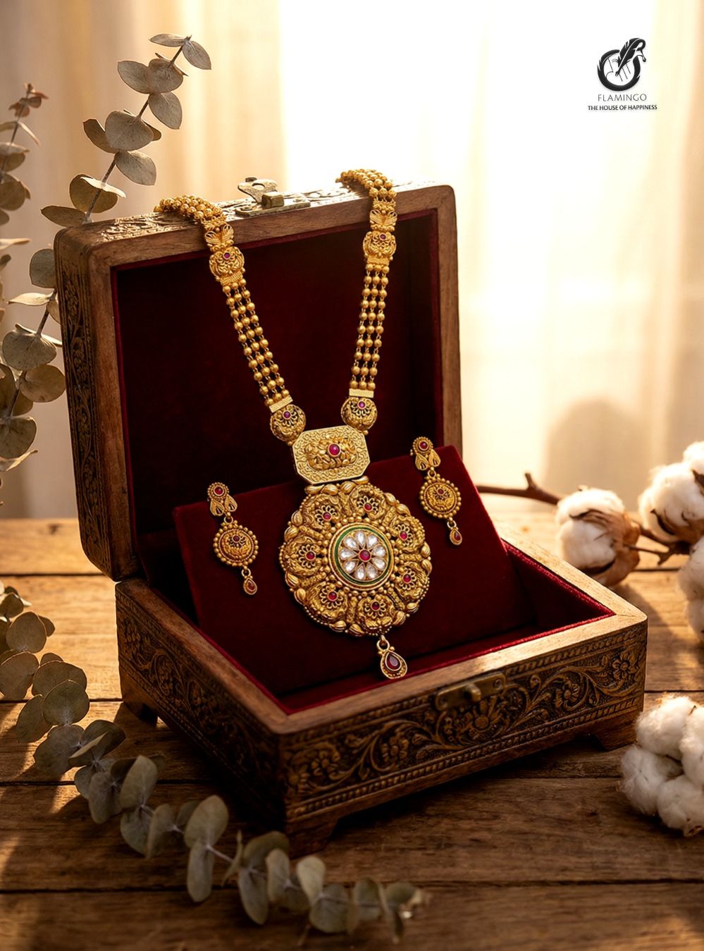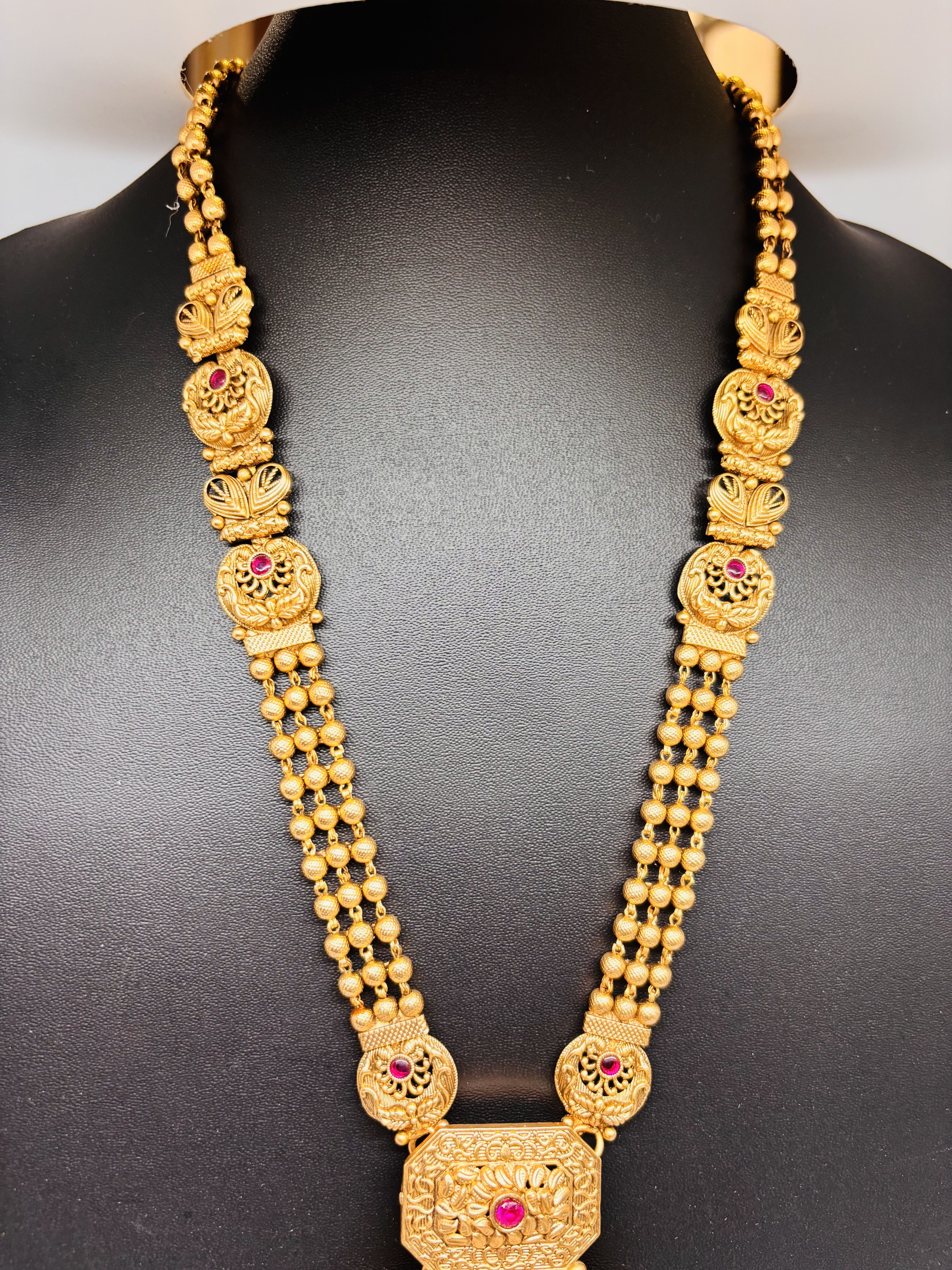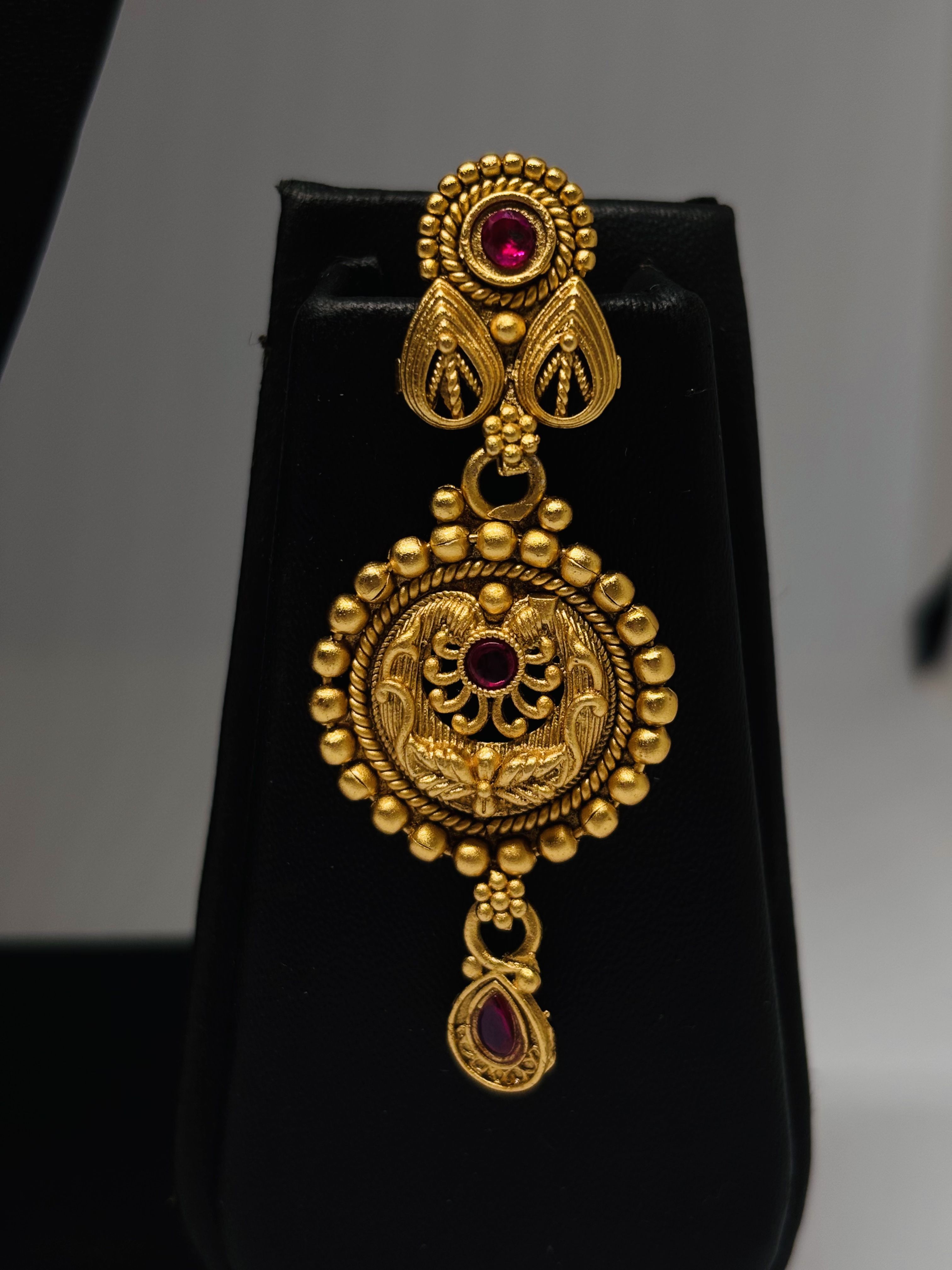 18K Gold-Plated temple jewellery set with intricate craftsmanship, featuring a majestic centrepiece and matching earrings – a divine blend of heritage and elegance