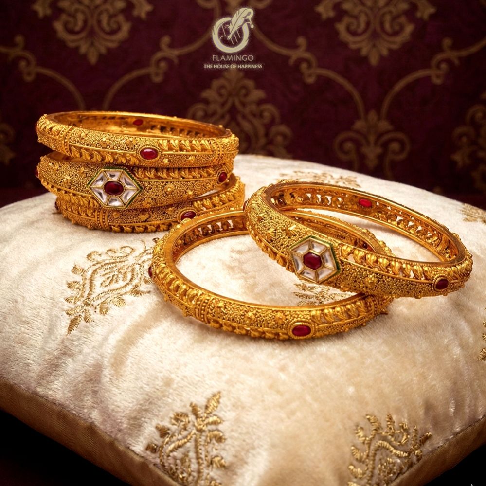 This Bangle set is The Flamingo’s exclusive Handcrafted Gold Plated Collection. It includes a set of 6 bangles, with 4 featuring a classic textured design and 2 showcasing an asymmetric pattern in between for a modern twist. Each bangle is adorned with red gemstones set in white‑enamel diamond‑shaped motifs, delivering timeless elegance and luxurious craftsmanship.