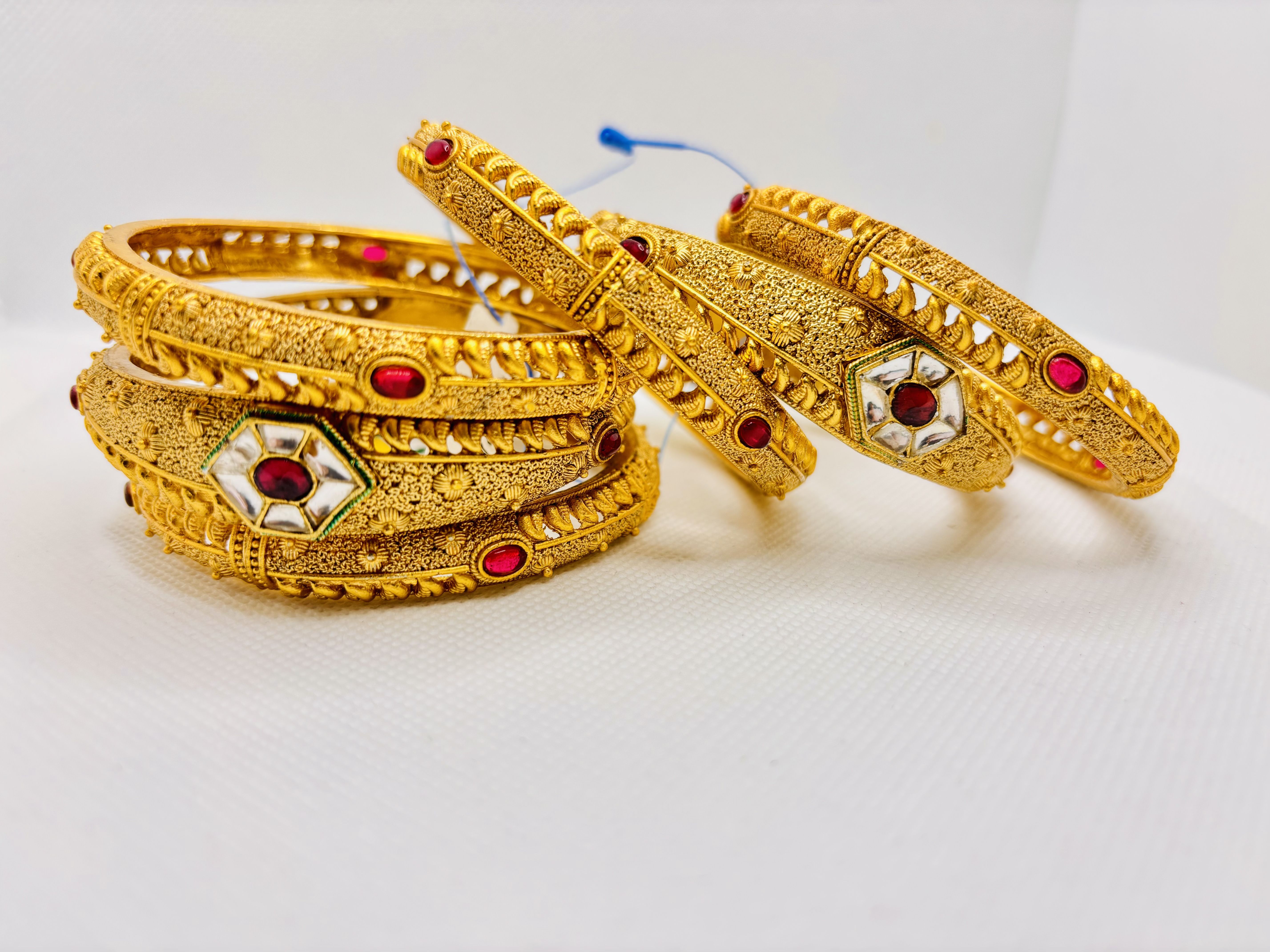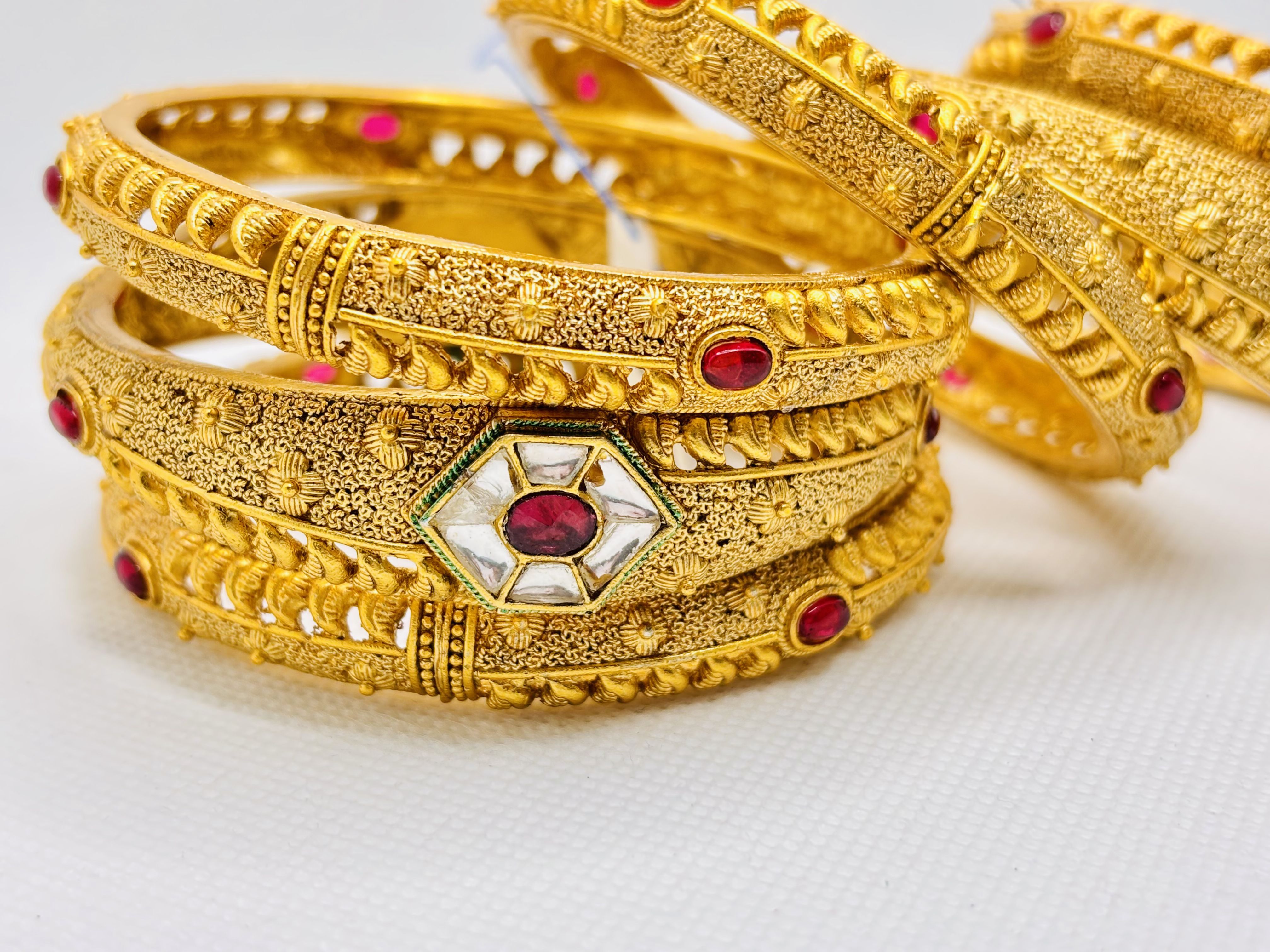 18K Gold Plated bangles with textured surfaces, red gemstones inset in white enamel diamond motifs, luxurious traditional craftsmanship.