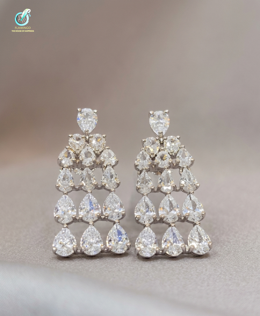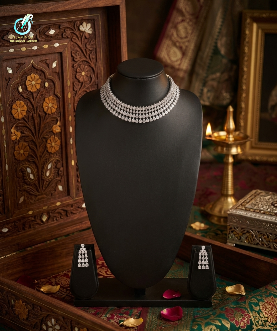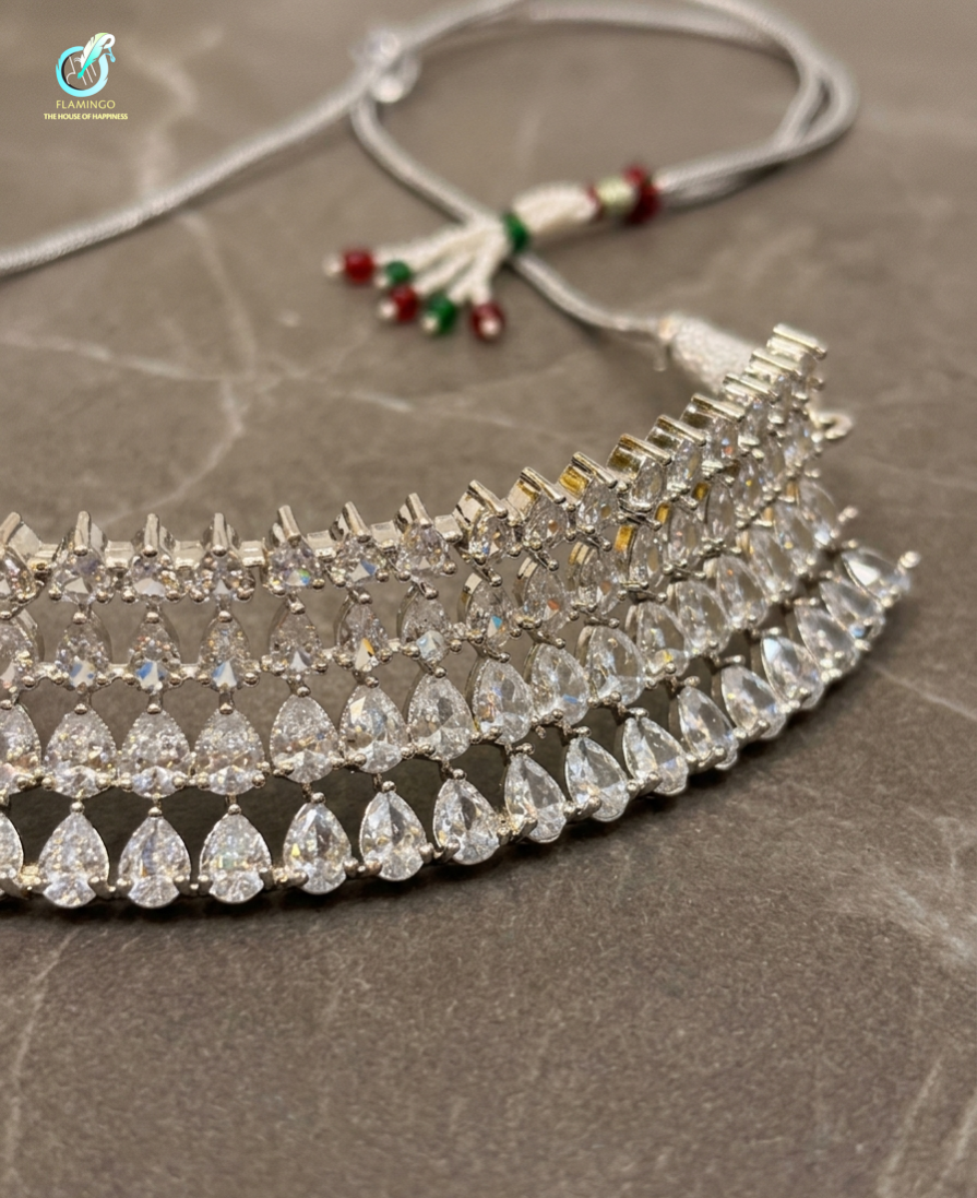 The Aavya Cascade is a masterpiece of light and luxury, inspired by the ethereal beauty of the first morning sun. This regal jewelry set features a multi-layered diamond-choker and matching chandelier earrings, meticulously crafted to drape with the fluidity of a shimmering waterfall. A stunning four‑layer, delicate graduated‑tire choker crafted from high‑quality, skin‑friendly material with an anti‑tarnish finish. Each layer is set with brilliant, pure‑cut teardrop stones that catch and reflect light from every angle, creating a luminous, cascading sparkle. The matching earrings feature the same elegant teardrop design heighted 6cm.