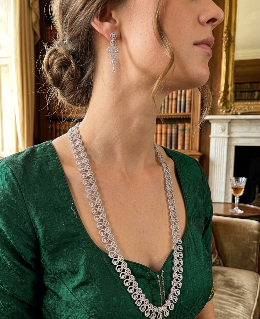 This exquisite silver long necklace features delicate diamond-cut circlest, paired with matching earrings that amplify the luminous charm. The intricate cut-out patterns add depth and texture, creating a captivating play of shine and shadow. Earring height- 4cm